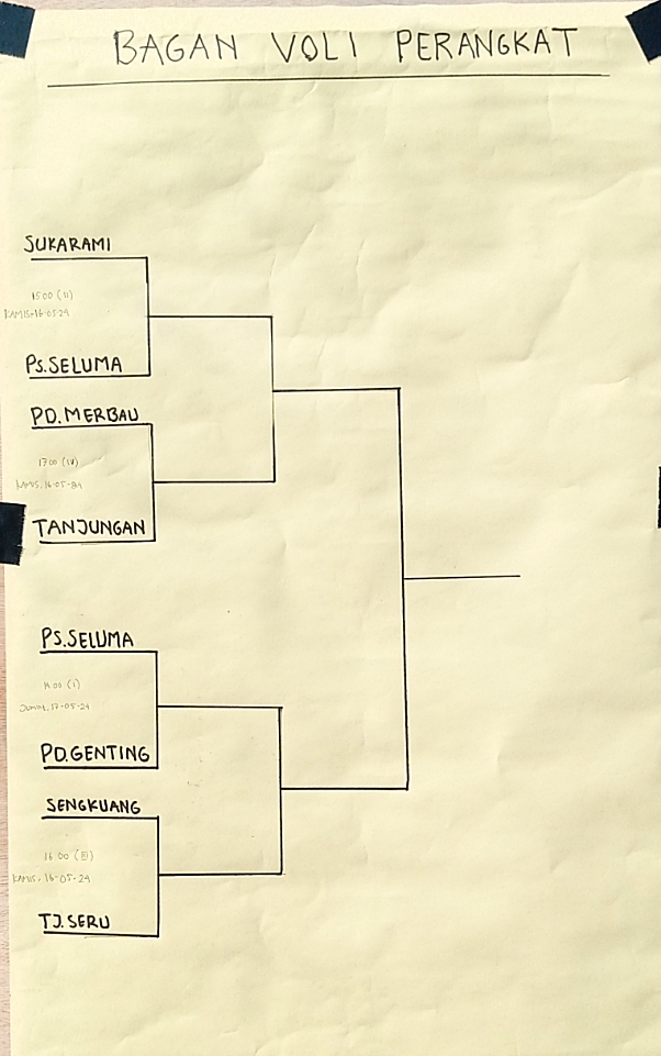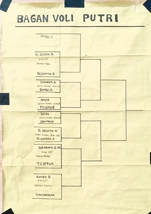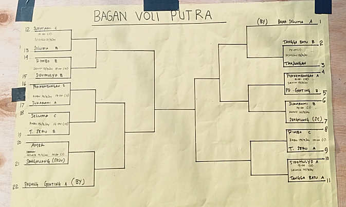 Berikut gambar Susunan Bagan dan jadwal pertandingan Bola Voli Putra dan Putri Kades dan Lurah Cup Kecamatan Seluma Selatan: