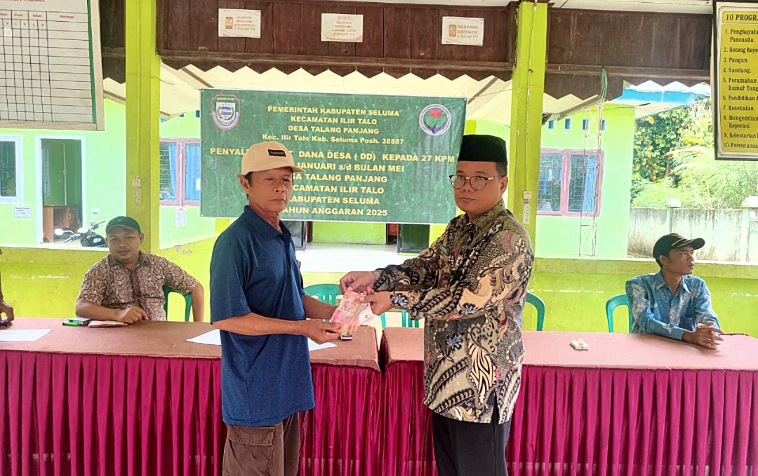 pensiljurnalis.my.id, Seluma – untuk membantu meringankan beban himpitan ekonomi dikalangan masyarakat bawah terus dilakukan, sesuai dengan regulasi dan Tahapan, Kamis (22/5/2025) Pemdes Talang Panjang, Kecamatan Ilir Talo, Kabupaten Seluma, menyalurkan Bantuan Langsung Tunai Dana Desa (BLT DD) tahun anggaran 2025.