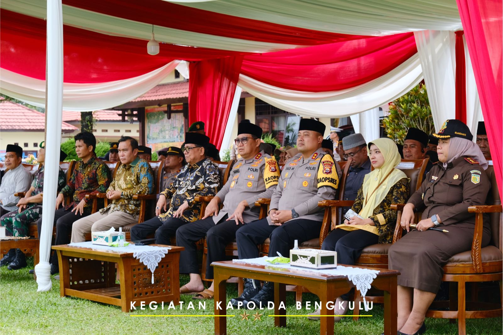 Turut hadir dalam acara tersebut, Bupati Dr. Ir. Hidayatullah Sjahid, MM, IPU, Wakil Bupati Zurdi Nata, S.IP, Kapolres Kepahiang AKBP Eko Munarianto, S.IK, Kajari Kepahiang Ika Mauluddina, SH, MH, Sekda Kepahiang Dr. Hartono, M.Pd, Ketua PN Kepahiang Hendri, SH, MH, Dandim 0409 R/L diwakili Pabung Kapten Inf Retno, Kepala Kantor Kemenag Kepahiang, Polres Kepahiang beserta Jajaran, Kepala OPD lingkup Pemkab Kepahiang, Camat, Beberapa Kades serta warga penerima bansos.
