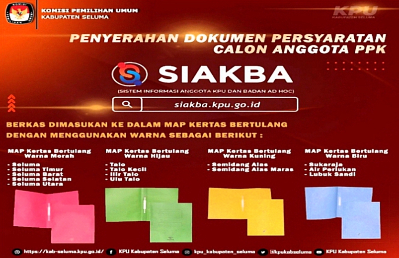 Ketua KPU Kabupaten Seluma Henri Arianda, menerangkan, dalam rangka pembentukan Panitia Pemilihan Kecamatan (PPK) untuk pemilihan Gubernur dan wakil Gubernur, Bupati dan wakil Bupati, Walikota dan wakil Walikota Tahun 2024, KPU Kabupaten Seluma mengundang dan mengajak warga negara indonesia yang memenuhi kualifikasi untuk mendaftarkan diri menjadi panitia.