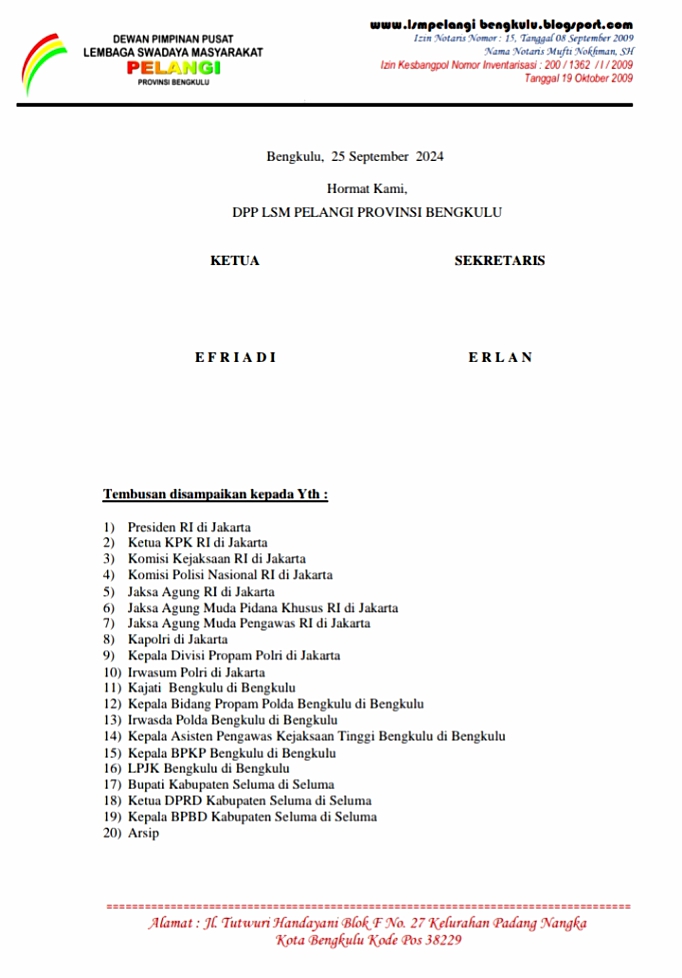 Melalui Pengaduan, LSM Pelangi Minta Polda Bengkulu Usut Kembali Kasus BTT Seluma