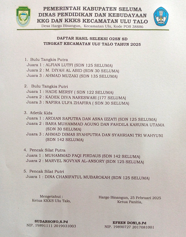 Untuk diketahui juga hasil seleksi O2SN SDN 125 Seluma menjadi juara umum, dan yg menjadi juara 1 setiap cabang yang dilombakan, akan bertanding kembali di tingkat kabupaten pada akhir April 2025, semoga bisa mengharumkan nama baik khususnya di Kecamatan Ulu Talo.