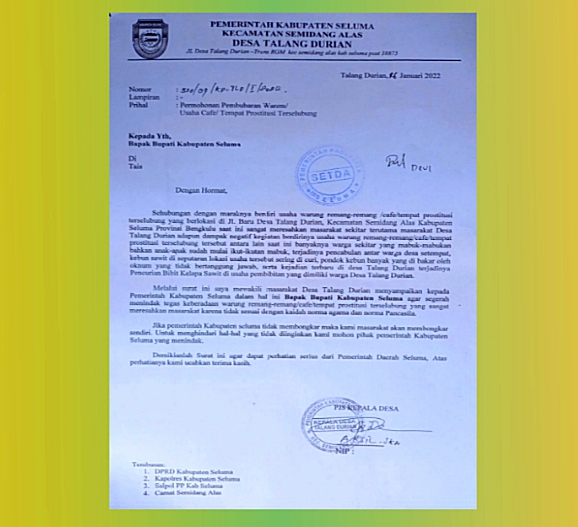 pensiljurnalis.my.id, Seluma – Kembali maraknya berdiri usaha warung remang-remang ( Warem ) di wilayah jalan baru Desa Talang Durian, Kecamatan Semidang Alas, Kabupaten Seluma, membuat warga Desa disekitaran lokasi tersebut merasa resah dan geram. terutama warga Desa Talang Durian. Selasa ( 1/2/2022 ).