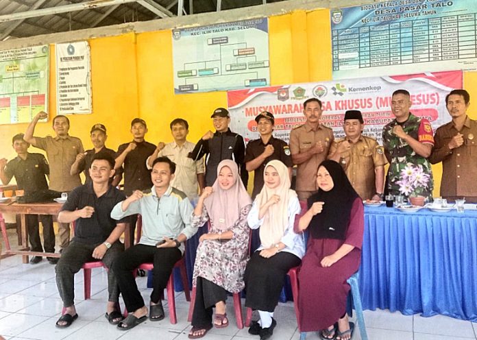 pensiljurnalis.my.id, Seluma – Sebagai tindak lanjut dari Instruksi Presiden Republik Indonesia Nomor 9 Tahun 2025 tentang Percepatan Pembentukan Koperasi Desa/Kelurahan Merah Putih, yang ditandatangani Presiden Prabowo Subianto pada 27 Maret 2025, Pemerintah Desa Pasar Talo, Kecamatan Ilir Talo, Kabupaten Seluma, Provinsi Bengkulu, menggelar Musyawarah Desa Khusus pembentukan pengurus koperasi.