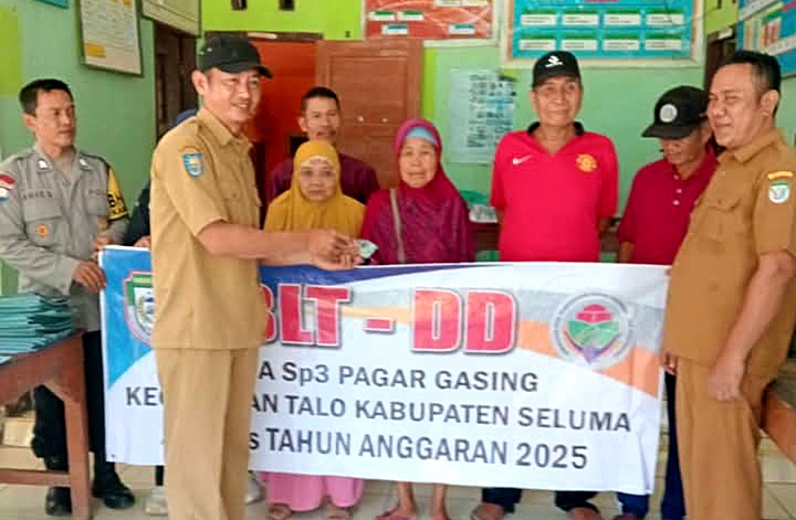pensiljurnalis.my.id, Seluma –Pemerintah Desa Simpang Tiga Pagar Gasing, Kecamatan Talo, Kabupaten Seluma, Provinsi Bengkulu salurkan Bantuan Langsung Tunai Dana Desa (BLT DD) Tahun Anggaran (TA) 2025 tahap I di Kantor Desa setempat, Senen (16/6/2025).