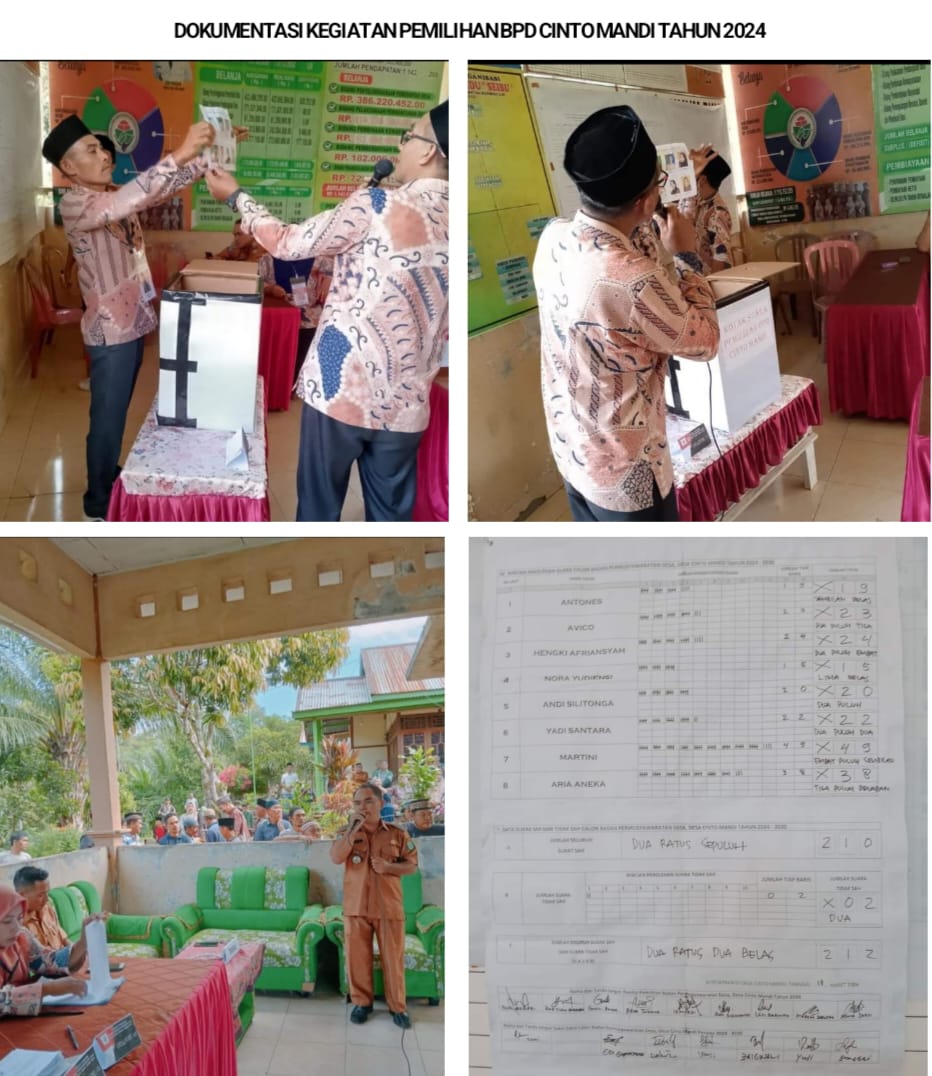 Kegiatan pelaksanaan pemilihan suara dibuka oleh Panitia Pemilihan BPD Desa Cinto Mandi dari pukul 07.30 WIB s/d 12.00 WIB.