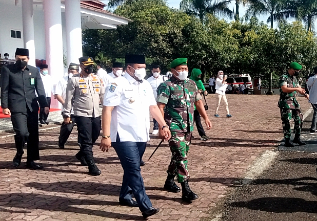 Gambar Danrem 041/Gamas Bengkulu didampingi Bupati Seluma saat menuju stand untuk meninjau vaksinasi massal.