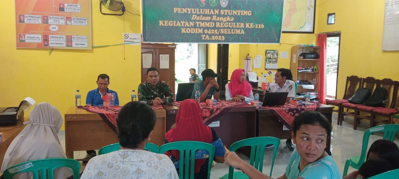 pensiljurnalis.my.id, Seluma – Pelaksanaan TMMD Reguler 116 Kodim 0425/Seluma di Kelurahan Talang Saling -Talang Dantuk, tidak hanya terfokus pada pekerjaan fisik saja. kegiatan dilakukan pada pelaksanaan TNI Manunggal Membangun Desa atau (TMMD) Reguler 116 Kodim 0425/Seluma, salah satunya dengan menggelar sosialisasi dan penyuluhan stunting yang diikuti oleh warga di Kelurahan Dusun Baru Kecamatan Seluma Kabupaten Seluma. Kamis (18/5/2023).