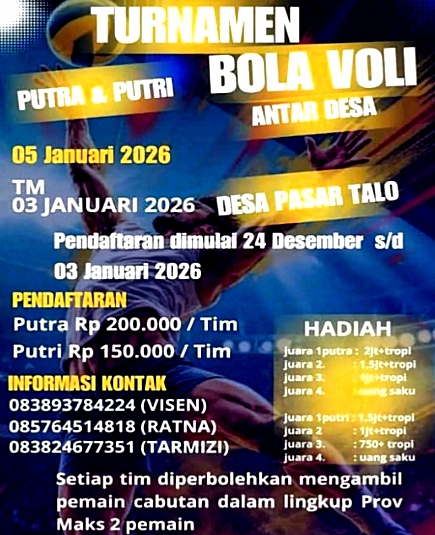 pensiljurnalis.my.id, Seluma – Mari segera daftarkan tim desa kesayangan anda, Turnamen bola voli bergengsi antar desa se-kabupaten Seluma, Provinsi Bengkulu, akan segera diselenggarakan di Desa Pasar Talo, Kecamatan Ilir Talo.